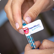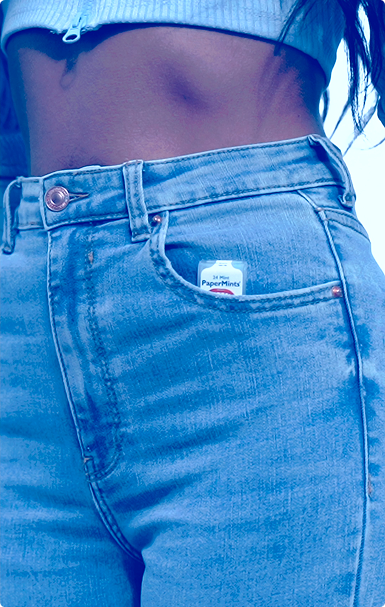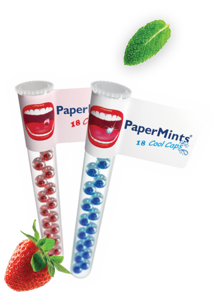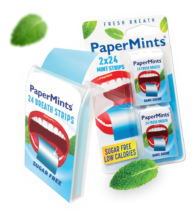 24 instant-dissolving mint strips for long-lasting fresh breath. Ideal for your pocket or purse. Papermints Strips, your breath freshener wherever you are. STOP chewing.